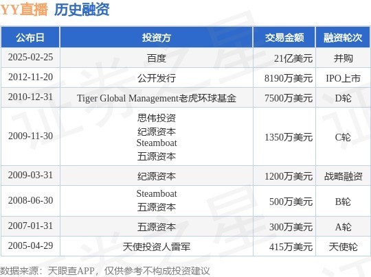证券之星消息,根据天眼查APP于2月25日公布的信息整理,广州华多网络科技有限公司并购融资,融资额21亿美元,参与投资的机构包括百度。